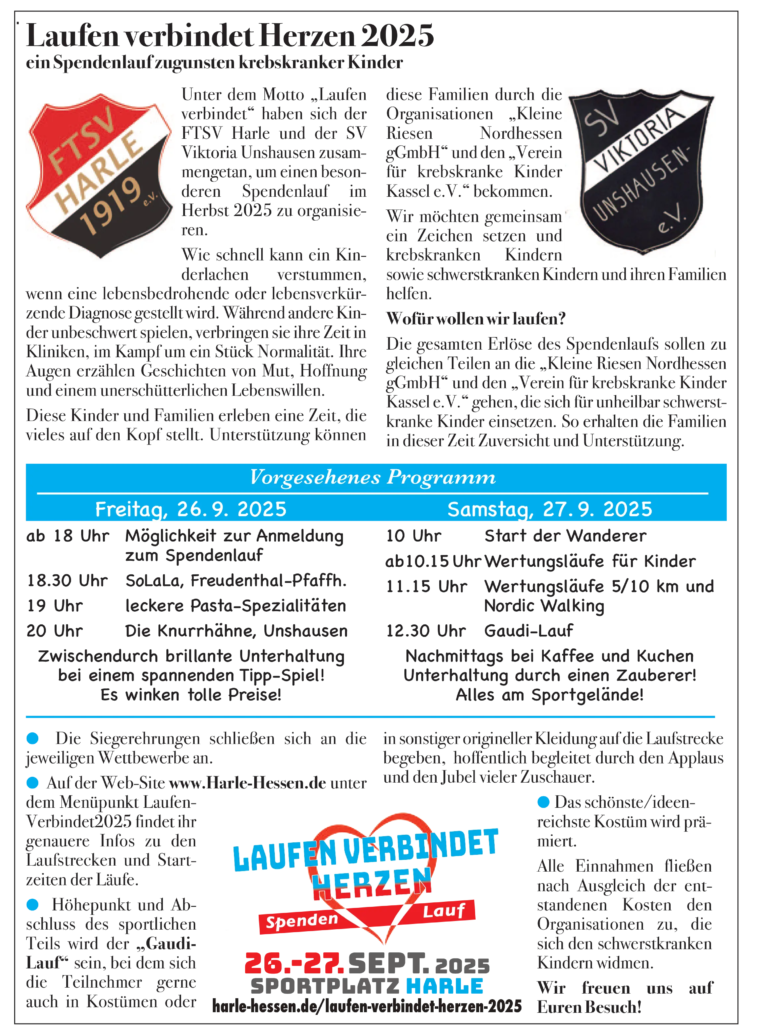 Der FTSV Harle und der Viktoria Unshausen laden ein zum Charité-Lauf 2025 zu Gunsten der Kinder-Krebshilfe in Kassel